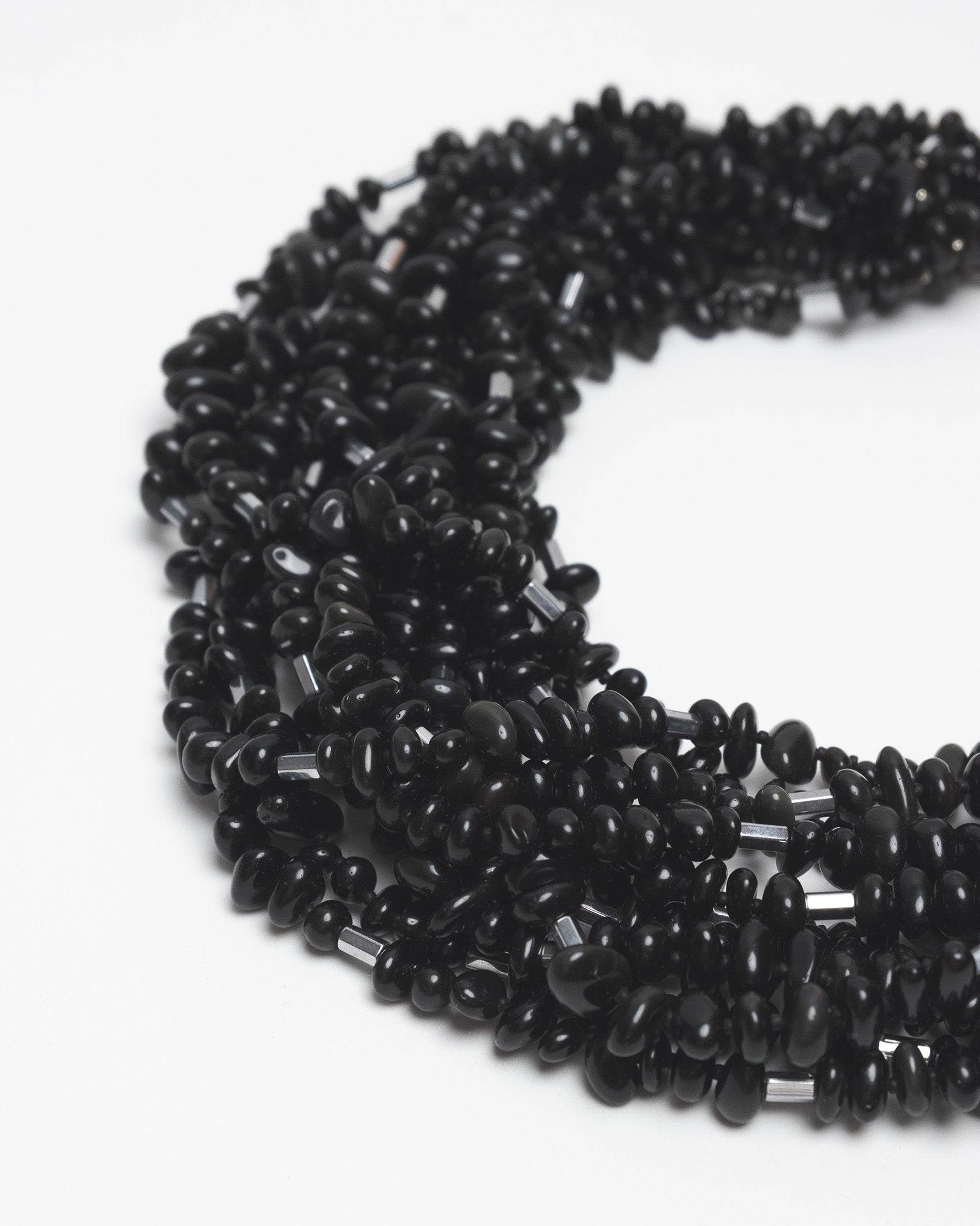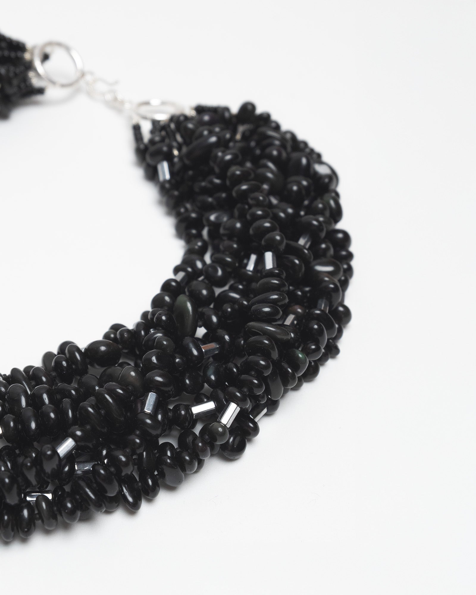 The necklace is composed of multiple delicate strands, combining deep-black obsidian with shimmering silver hematite beads, creating a fluid layered silhouette with subtle contrast and refined brilliance.