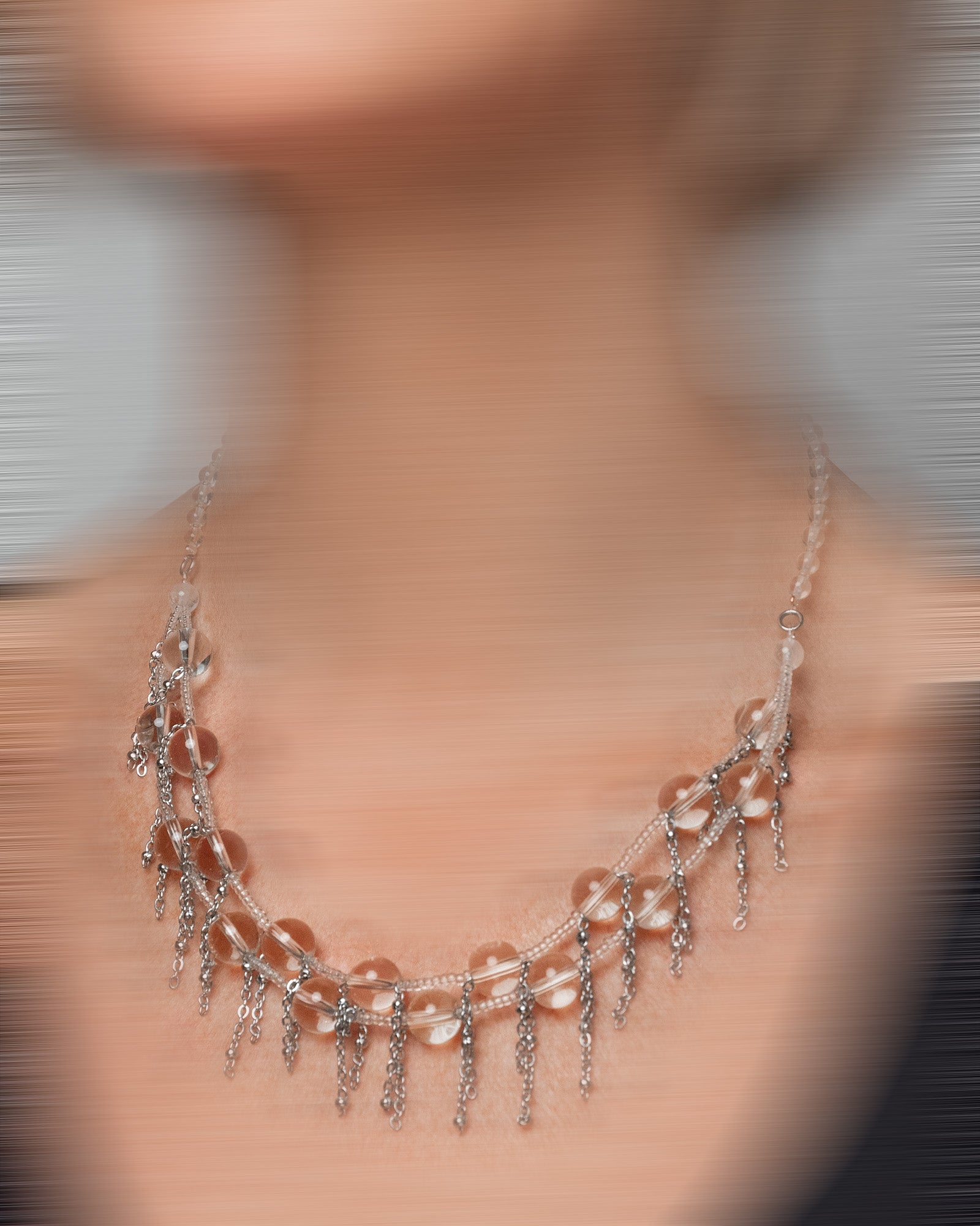 Materials: High-clarity quartz beads, stainless steel chains, metal findings.