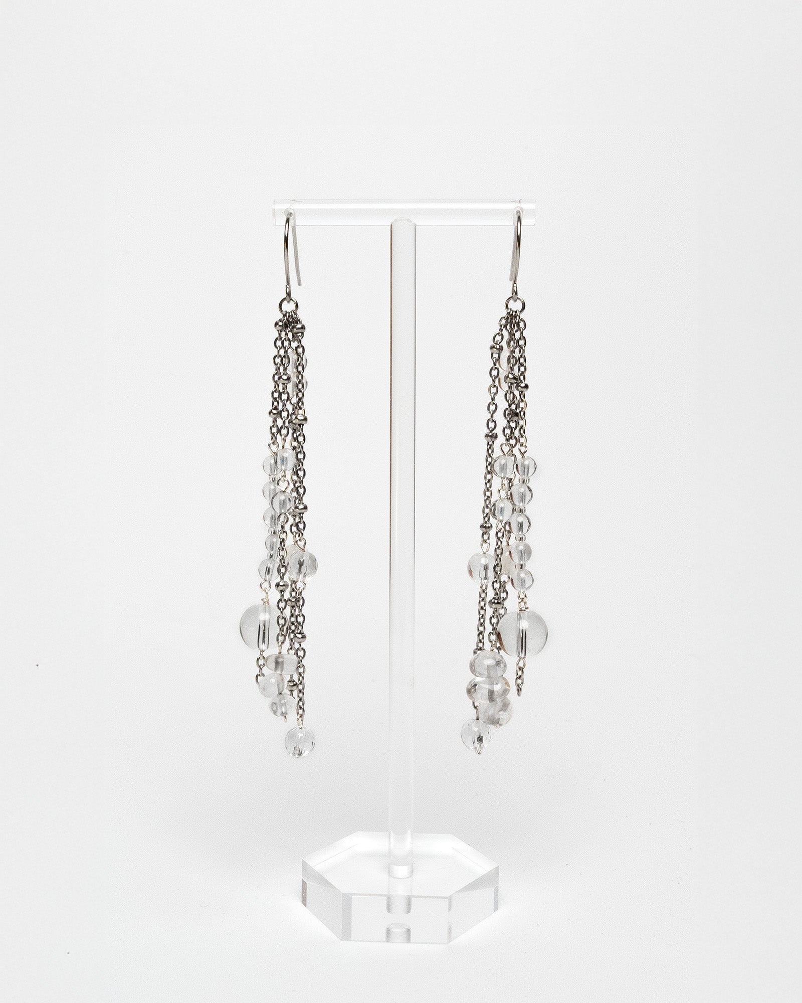 These earrings blend the purity of quartz with the modern aesthetic of stainless steel. The four-chain fringe design moves gracefully, catching the light in every angle — a perfect statement of minimal elegance and quiet strength.